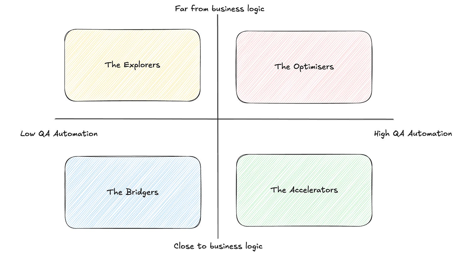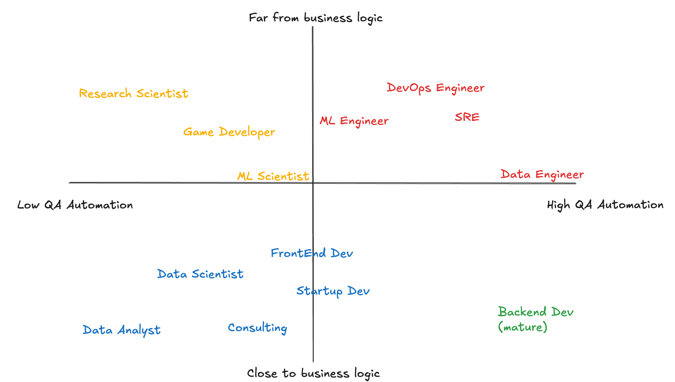 There is a certain association between being high on this dimension and how close to the business problem you are, but not a full association. However, when you’re very close to business problems, it does get very hard to have QA automation, as the main source of quality / error will be alignment to business logic, which is, almost by definition, untestable in a standard pattern (unless your organisation is very mature and has a huge library of tests).
