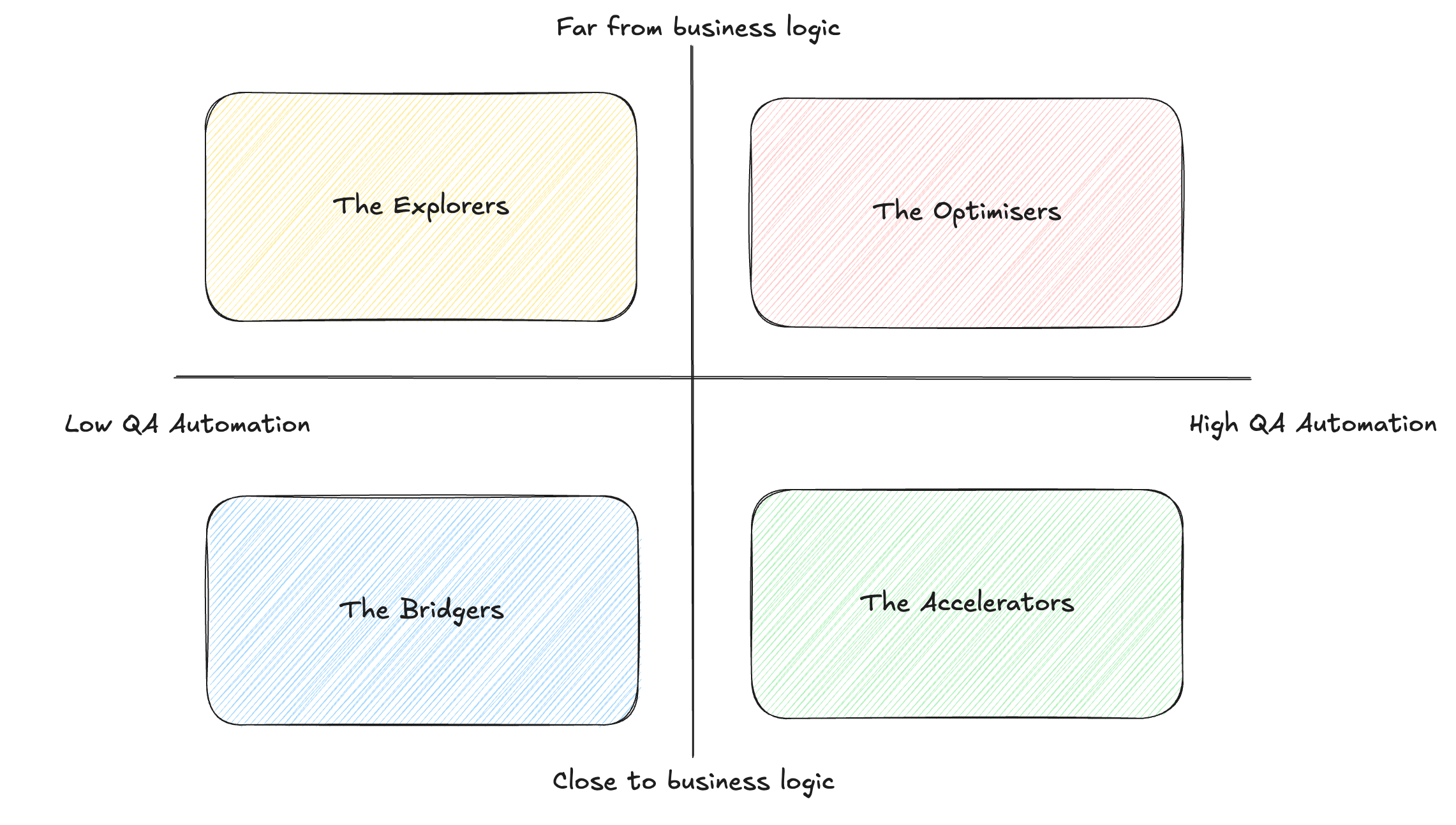 So how will you know whether to invest into investigating agentic? I propose a simple 2-dimensional framework. How close you are to the business problem, and what is the level of strictness in your software domain. By using this framework, you can divide most software disciplines into 4 quadrants, that I call Optimisers, Explorers, Accelerators and Bridgers.